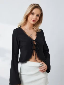 Women Front Tie-up Blouse Lace Trim V Neck Long Sleeve Cardigan Shirts Spring Fall Casual Retro Sexy Tops Y2K Aesthetic Clothes