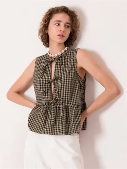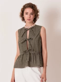 Women Sleeveless Blouse Front Tie-up Cut Out Ruffle Tops Babydoll Summer Plaid Print Casual Retro Vest Shirts