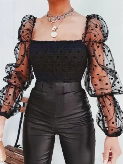 Women Vintage Tops and Blouses Mesh Puff Long Sleeve Square Neck Crop Tops Summer Fall Sexy Shirts Blouse Female