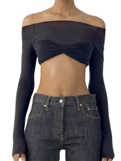 Women Fashion Blouse Long Sleeve Off Shoulder Ruched Twist Corset Crop Tops See Through Club Sexy Chic Shirts Summer Fall